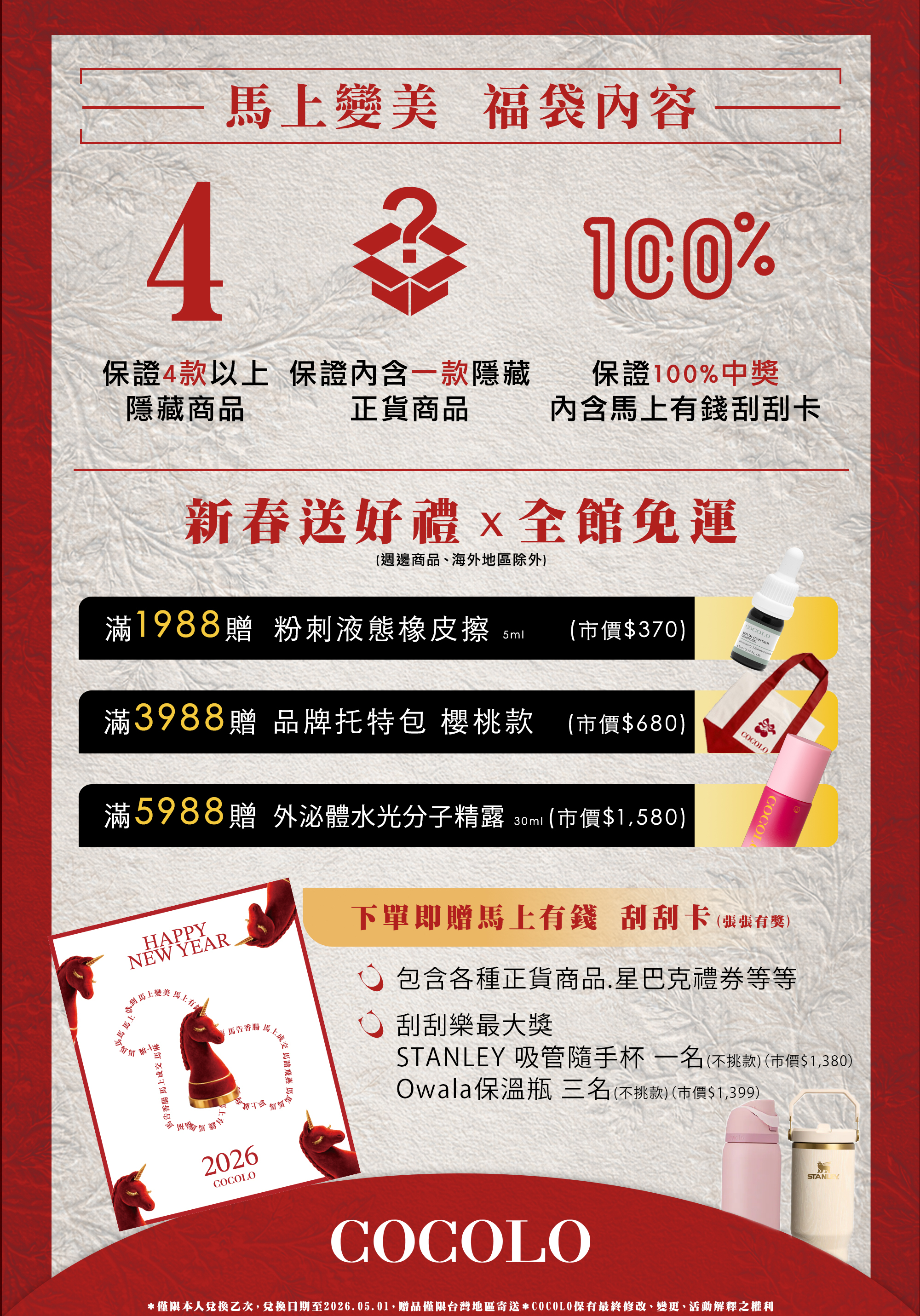 至2026-04-30T16:00:00.000+00:00截止 指定分類,滿2800贈 COCOLO 收藏妳的美一面 小卡乙張 不累贈